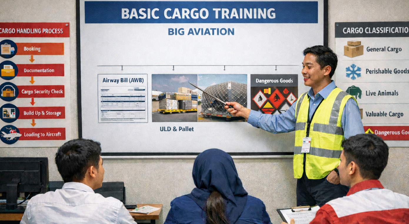 Basic Cargo & Dangeraous Goods — Bandara adalah kegiatan penanganan dan pengelolaan barang kiriman melalui jalur udara sejak barang diterima hingga dikirim ke tujuan. Proses ini mengutamakan keamanan, kecepatan, ketepatan, dan